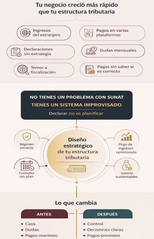 Agencia de desarrollo de software con ingresos altos en Perú y el extranjero: tenía tres regímenes tributarios mal asignados, boletas duplicadas y cobraba IGV donde no debía. Rediseñamos su estructura tributaria, optimizamos su régimen y